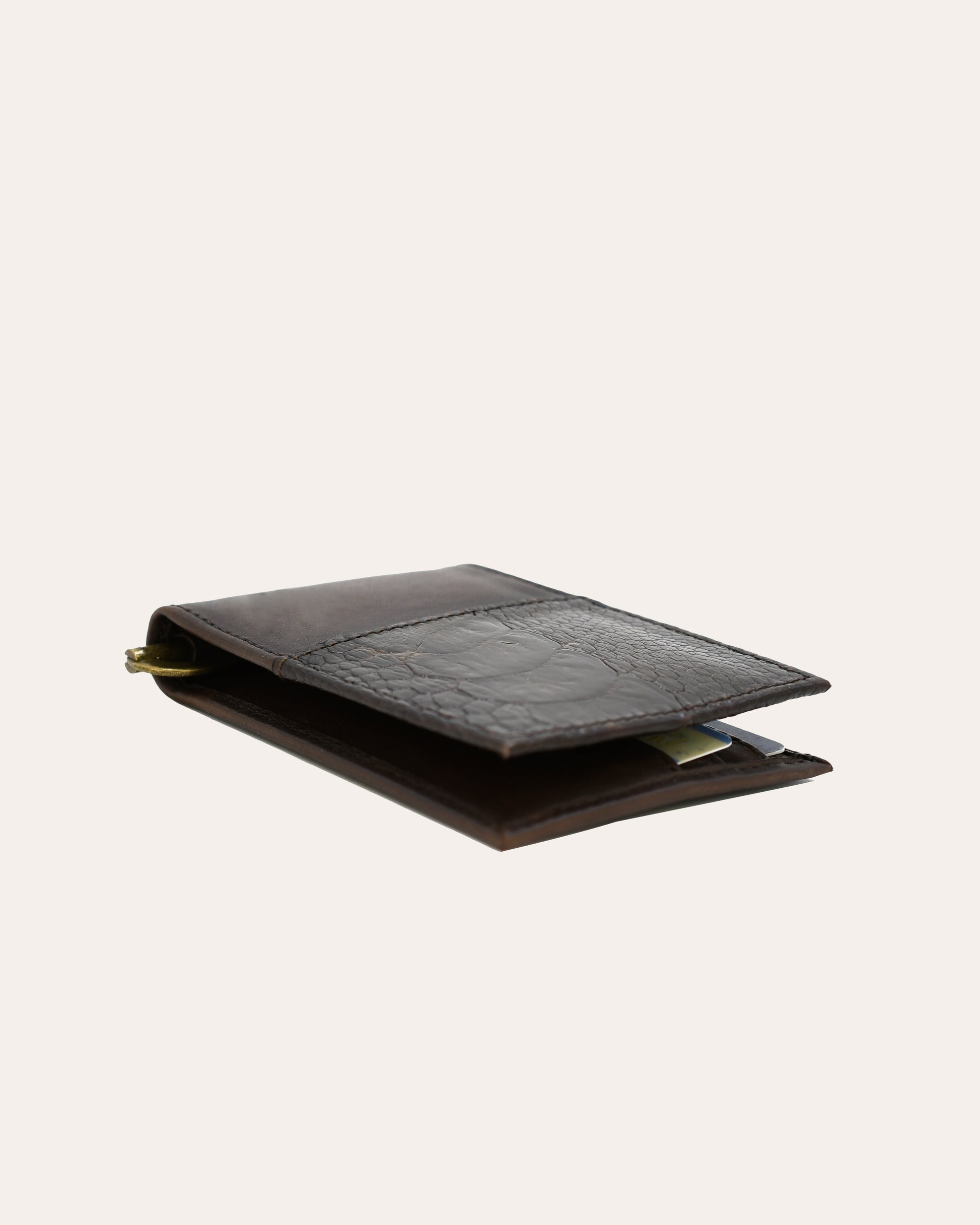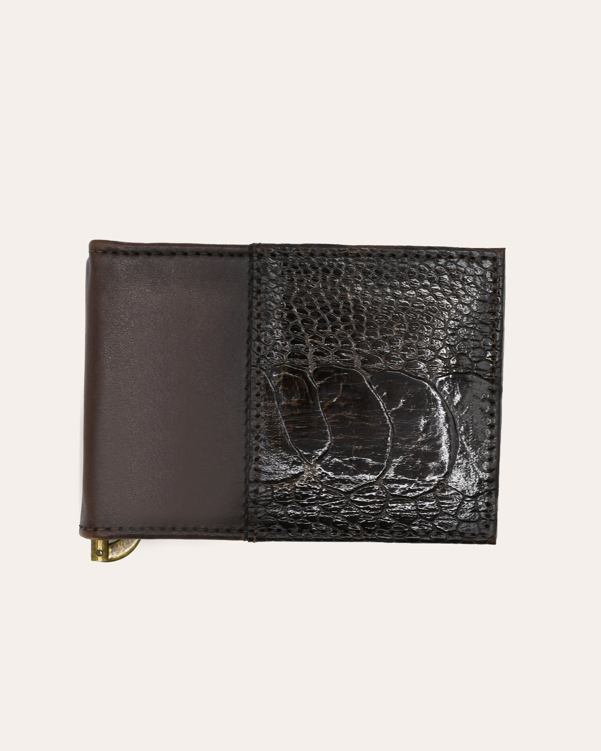 Esta cartera combina piel 100% natural con un injerto en piel genuina de pata de avestruz, una de las más valoradas por su patrón único, resistencia y tacto excepcional.
